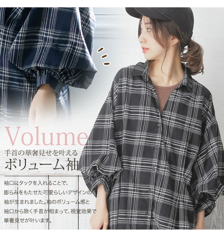 ボリューム袖 チェック柄 八分袖 シャツワンピース 大きいサイズのハッピーマリリン